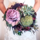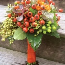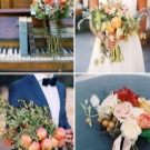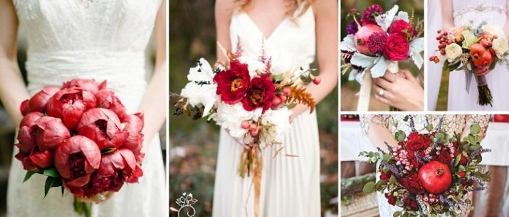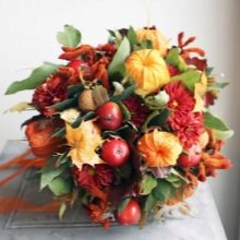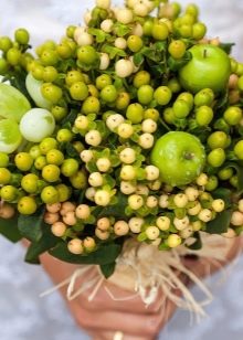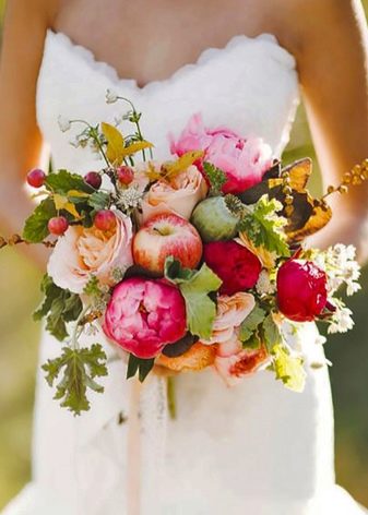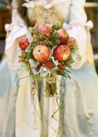 If the wedding takes place in the fall, the composition can be composed of burgundy or bright yellow apples, with fruits of mountain ash or rose hips, as well as flowers (chrysanthemums, gerberas). A bright accent will be the bouquet, which includes burgundy apples, peonies and ruby berries. This bouquet personifies love and brightness of feelings and playfulness.