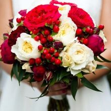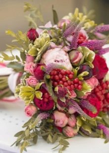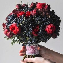 Many argue that a girl who chooses berries in addition to the flowers herself in her bouquet is very romantic, she has an exquisite taste. Such compositions are suitable for completing a cute and sophisticated look, for girls who do not want to be invisible at their wedding. At the same time, they will not seem too pretentious, on the contrary, they will seem modest.