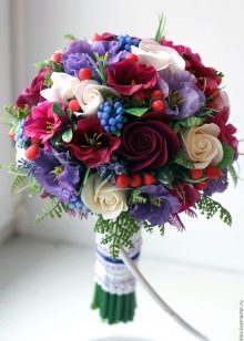 Bouquets with berries are usually inherent in the summer season, since berries are strongly associated with this period. And to create a composition there are whole bushes of fresh berries: raspberries, strawberries, blackberries, currants, cherries. In autumn, the composition will be more muffled in color, as a basis it will be possible to take berries of viburnum, rosehip, mountain ash, cranberries.Such weddings are more comfortable in the combination of colors.
