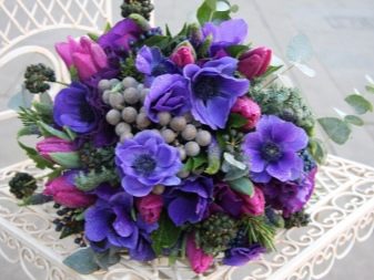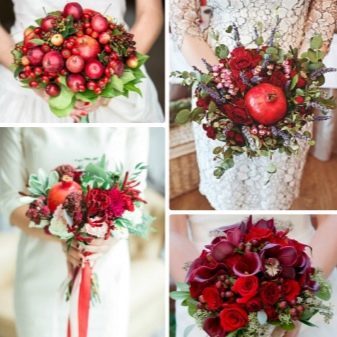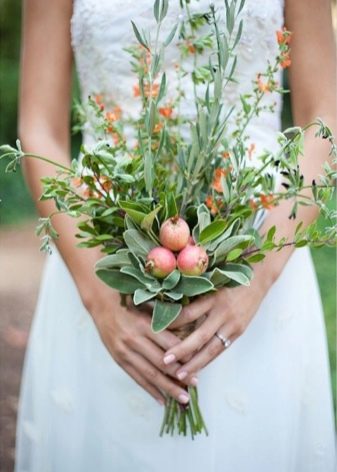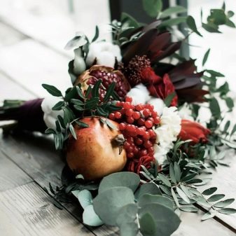 The bouquet will be very catchy, the center of which will be a whole pomegranate. The composition of the bouquet can include burgundy and violet flowers, purple or brown berries will become bright accents. If the wedding is planned in blue, then this shade can be easily beaten with plums, grapes, blueberries. In this case, such a composition should be diluted with slightly warm shades.