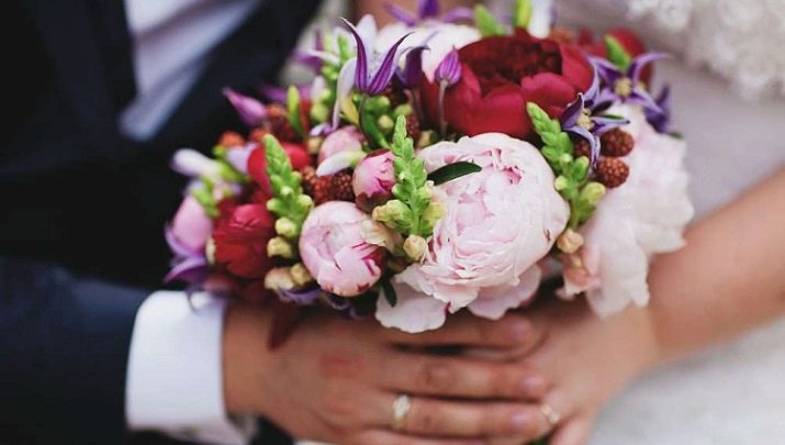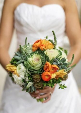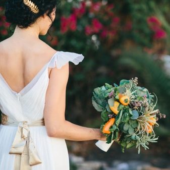 The bride’s bouquet can overlap with the theme of the wedding, and with the groom’s boutonniere. You can choose as a basis as a single product, or to compose whole compositions. You can add anything to the bouquet: greens, decorative cabbage or bell peppers.