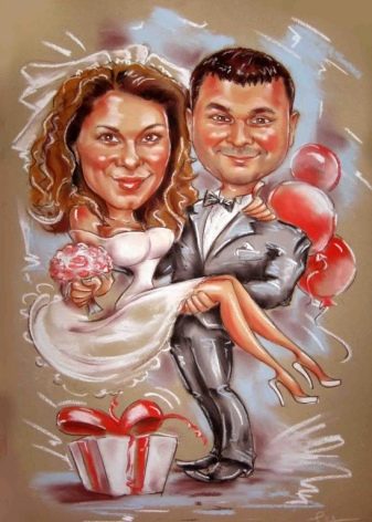 - Funny cartoon. Order such a gift from the master. To do this, you need a photo of the couple with whom he will be drawn. You can also independently build it from photographs and finished elements.