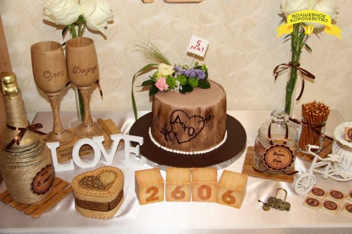 - Holiday cake. He certainly brings a moment of solemnity and significance of the event. For such a holiday, bother to book it in advance. It may look like a wedding one with the inscription “5 years” or wedding rings with the number 5. It will also be appropriate to ask the pastry chef to make it thematic, that is, in the form of a tree or simply decorative edible elements in this theme.