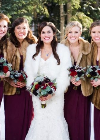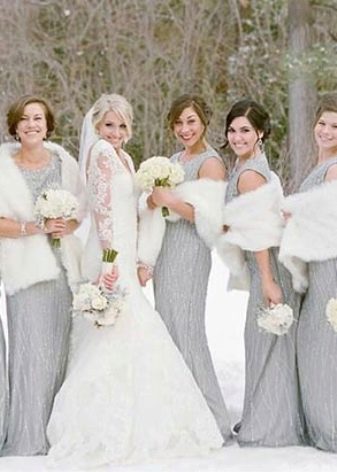 - Winter season. Weddings held in winter, late autumn or early spring dictate their conditions when choosing the right clothes. First of all, it should be warm, so that the festive mood does not turn into a cold by the evening of the celebration.