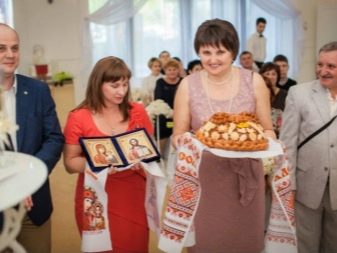 In ancient times, newly-married spouses began their family life in the groom's house. That is why the wedding loaf was taken out by the husband's parents. We met young people on the threshold of their parental home. The loaf and the salt shaker held the mother-in-law, while the mother-in-law held the icon in her hands, which blessed the newlyweds in a happy marital union.