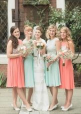If the dress code for the colors at the wedding is not defined, then you are given complete freedom of choice. Rely on the time of day at which the bulk of the celebration will take place. If the holiday is planned for the middle of the day, then discreet pastel shades are ideal. If you want to choose something brighter, then you can afford to wear a peach or purple dress.