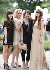 If you are a strict opponent of any kind of dresses, then no one will forbid you to go to a wedding in a pantsuit. Nobody speaks of a strict office style, here you can afford an outfit, for example, of gold lace. Pantsuit is also a suitable choice for a wedding celebration. The lower part can be either a straight silhouette or a flared.