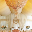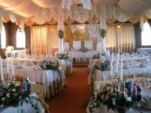 Decorating the ceiling with fabric is recommended when the wedding has a certain thematic direction, so that some elements of the restaurant's decor do not violate the integrity of the concept. In addition, the drapery of the ceiling space with a cloth will allow you to divide the room into zones: a dance floor, a buffet table, a sweet table and others. Decoration with fabric along with the colors of columns, arches, stairs, doors will give the hall a festive atmosphere. It must be remembered that you can fix the fabric on the ceiling only with the help of special fasteners. It is better to choose a translucent fabric (chiffon, mesh, tulle, guipure), which will give the interior of the room tenderness and grace.