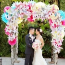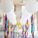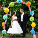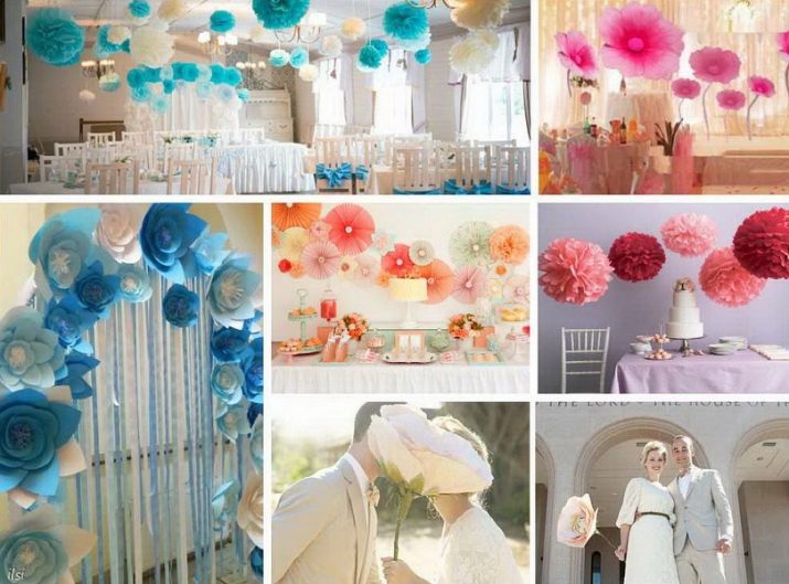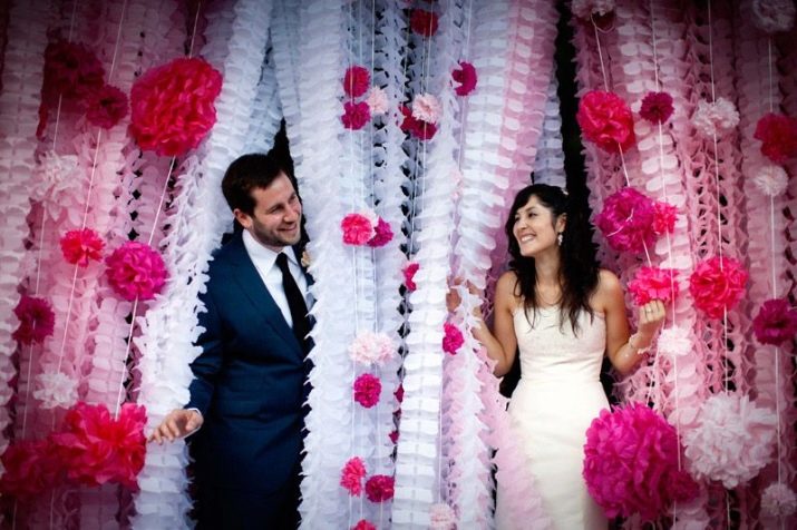 You can make pompons from corrugated paper or crepe paper, which are ideal for decorating the area behind the newlyweds, the ceiling, walls, arches, columns. Jewelry is made very quickly. In addition to paper, you will need scissors and wire. The color of the pompons should be the same as the main color of the decorated banquet hall. From pompoms for backdrop decoration, you can make long garlands and weave them in the form of rings or hearts. All decor elements must be paired. To make the decor look bright, for the basics it is worth choosing corrugated paper in saturated colors.