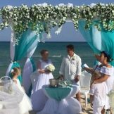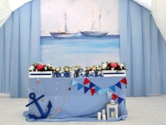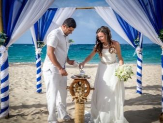 For a wedding in this style, you need to choose the appropriate tones: white, blue, turquoise, sand. The ceiling and walls can be decorated with sails, and a vest should be worn on some objects (bottles, decanters). “Marine” photographs can be hung on the walls, and copies of marine life can be found on shelves and ledges.