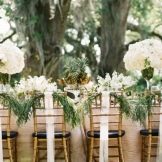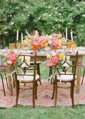 As for the decor of chairs, then it is quite possible to limit ourselves to the usual option: use plain covers, tied with a bow on the back. The decor will look good, in which the bow on the chair combines with shuttlecocks, echoes in appearance with fabric ornaments placed along the edge of the table. Covers can be replaced with colored satin ribbons. The decoration with ribbons in the open air will look especially beautiful, since the breeze will pick them up and sway. As a decor for chairs, you can use small floral arrangements attached to the back, or even whole flower garlands. Original signs on newlyweds' chairs will look with inscriptions of names or only initials, as well as children's photos.