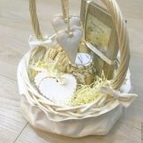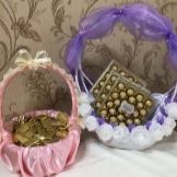 In order for the newlyweds to immediately find their places in the open-air ceremony, not only nameplates with signs, but also large white balls can be attached to their chairs. Wedding baskets can replace the effect of a dozen vases with their stunning appearance. Such decorative objects are placed around the perimeter of the banquet hall. They can be decorated with lace, satin ribbons, organza roses, pearls, feathers, rhinestones, soft toys, sweets, fabric figures of butterflies.