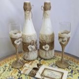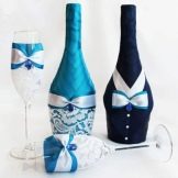 On the table of the newlyweds, according to the tradition that has been established over the years, there are two bottles with alcoholic drinks, which are opened not during the wedding, but on the first anniversary and in honor of the baby’s birth. You can decorate them in different ways, for example, tie a satin bow that matches the environment in color. You can decorate them under the outfits of the bride and groom with the inclusion of details that are really present on the costumes of the heroes of the occasion. You can decorate champagne with original labels made to order, since now this is not a problem. As a supplement, you can include young photos in the label. You can make bottles of alcohol and glasses in the same style.