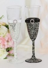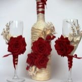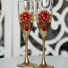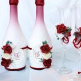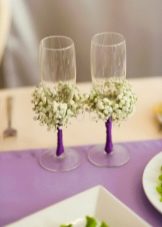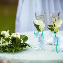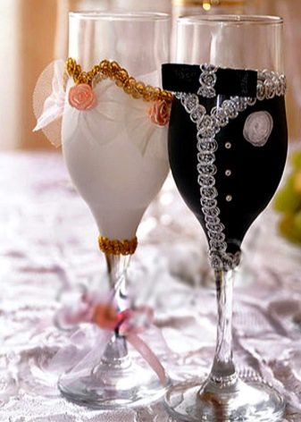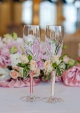 Glasses of the newlyweds can be painted with special paints on glass. As a pattern, you can choose openwork ligature, branches with blossoming leaves. If the final result seems to you too faded, the leg of the glass can be decorated with a small magnificent bow. You can decorate the glasses of the young with small living flowers, for example, buds of spray roses. Ideally, if the flowers are the same as in the bridal bouquet. You can take not whole buds, but separate petals, fixing them with an overlap with glue. However, this option will look perfect for a short time, then the petals will fade, lose their shape, may sag or wrap.