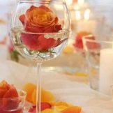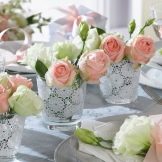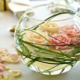If vases with fresh flowers are planned on the tables, then the distance between them should be at least 1.5 meters, and the height of the compositions themselves should not exceed 25 centimeters. If the event takes place in the fall, multi-colored leaflets can be put in vases along with living flowers. Vases for bouquets can be selected tall and thin, resembling wine glasses, and can be flat vessels on thin high legs. Volumetric vases with water look very stylish, on the surface of which buds of roses are floating. You can complement the unusual composition with floating candles.