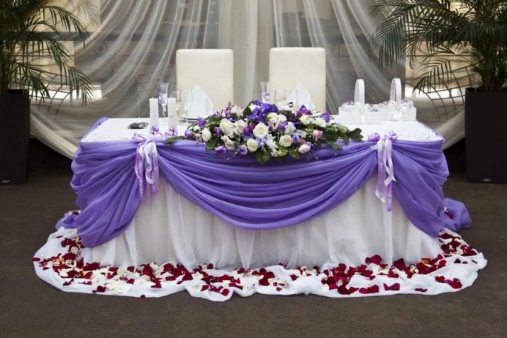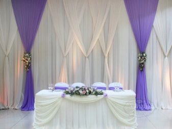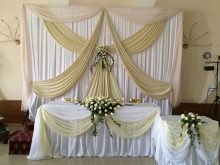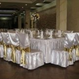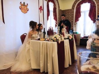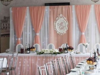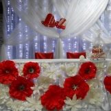 When drawing up a general plan for decorating a room, you must immediately decide whether the place for the bride and groom will stand out against the general background or whether it will fit harmoniously into a single concept, what materials need to be purchased, how to combine all the items in the room into a single concept. Tables are best covered with tablecloths in white, golden hue or the color of baked milk. Such colors will be in harmony with any service and the overall style of the event. It is recommended to decorate tablecloths with tulle, lace, satin ribbons or artificial flowers.