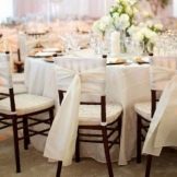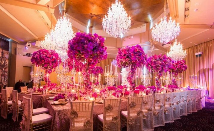 If bright colors are chosen for the design of the wedding, they should be found in strokes, as accents, and not everywhere. Moreover, these colors can be found not only in the main tone, but also in its shades, and they should be slightly muffled in more calm tones. The decor of chairs for guests is not always appropriate. For example, if the chairs are soft, without damage and scuffs, you should not decorate them with a cloth or bow (unless their coloring does not contradict the basic color scheme of the room). If there are a lot of decor items in the room (paintings, columns, large chandeliers, floor carpet in bright colors), then you need to bring in some other elements to a minimum. Enough will be the bouquets on the table.