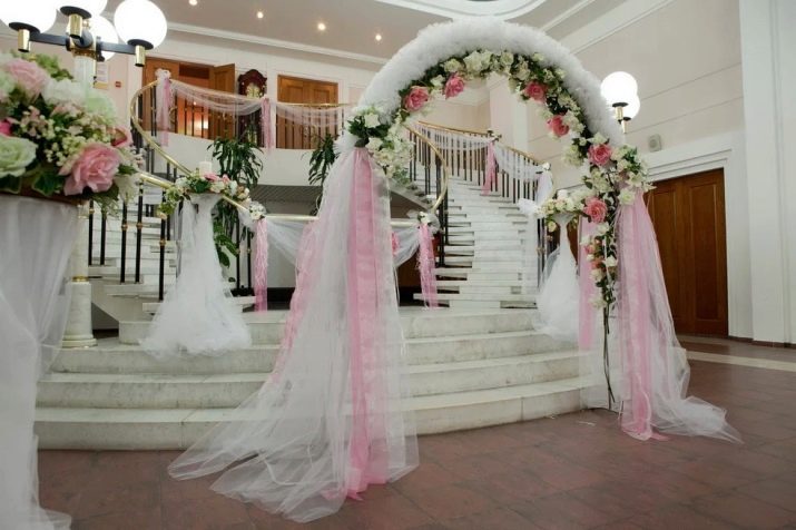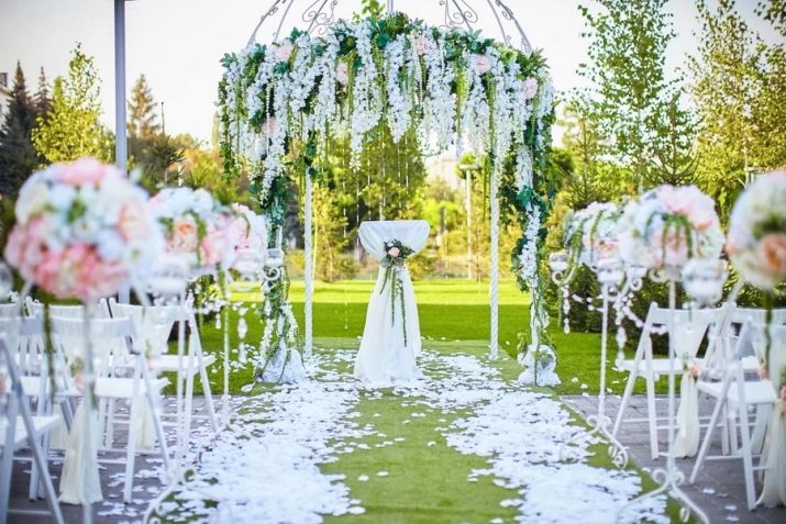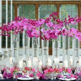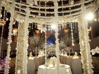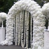 Decorating a room and an entrance with fresh flowers will always look beautiful and relevant. From them you can make small bouquets and arrange them in different places of the room.In addition to an attractive appearance, the plants will give their sweet fragrance, which will significantly affect the mood of the bride and guests. Whole garlands can be formed from living plants, making even the simplest tent festiveinstalled on the street for a wedding banquet, and a gazebo, which can be used as a photo zone. When decorating a banquet hall with flowers, it is necessary to choose varieties that for a long time retain a beautiful appearance. Room decoration is carried out on the eve of the wedding.