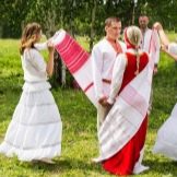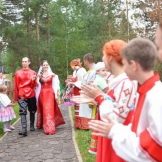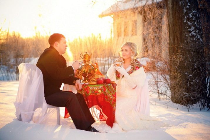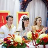 At the wedding in the Russian style, the newlyweds are not laid out in separate places. They are surrounded by guests. An integral attribute of a Russian wedding is a samovar, dishes made of wood. The interior with decorations in the form of wildflowers (to form small bouquets from them and put in vases) and wheat ears will be ideal. For the winter wedding in the Russian style, all the same features are characteristic, only the outfits of the young and the entertainment change to match the time of the year.