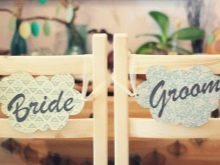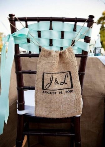 - The decor of wedding chairs looks original in the form of a canvas bag and with the initials of the young and the date of the wedding.