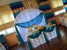 You can transform the room, "fit" it to the desired style and color, using drapery fabric. In addition, the material will hide from the eyes all quality defects in the hall. The fabric can decorate any surface, not only the walls and flow space, but even the floor. It is not necessary to drape all the walls completely (if there is no objective reason), it is enough to highlight the most important areas with the material: places for young people, for parents, a table with sweets, gifts.