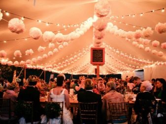 To decorate chairs, walls or a wedding arch, paper lanterns can be made. They will be appropriate for the design of the photo zone. These decorative elements can be fixed under the ceiling, like the starry sky, or be combined into one long garland. If the general style of the banquet hall is made in light pastel colors, lanterns can be made of bright paper.