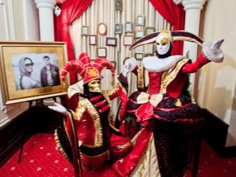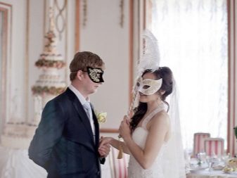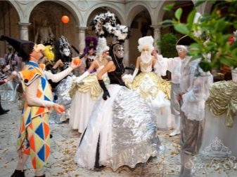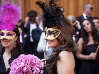 As well as for any similar celebration, for the wedding stylized under a carnival bright colors, gloss, extravaganza are characteristic. The main color of the wedding celebration in this style is gold. If the wedding is held outdoors, then tents made of bright fabric can be broken. For decor, greens, flowers are used. The walls of the restaurant can be decorated with paintings corresponding to the chosen theme. For greater realism with a real Venetian carnival, colorful balls, carnival masks, textile elements, fans can be used in interior decoration.