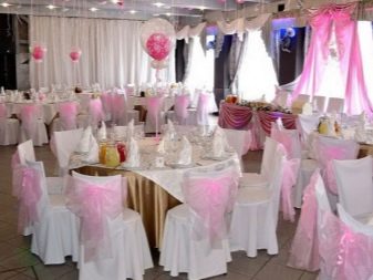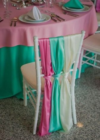 - This is a simple but very original decor of chairs with satin ribbons of three colors (pink, mint, white), corresponding to the color scheme of the festive hall.