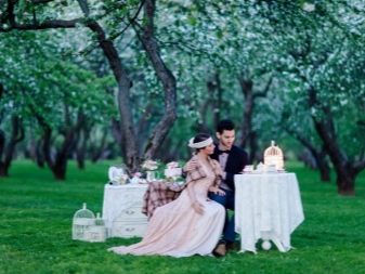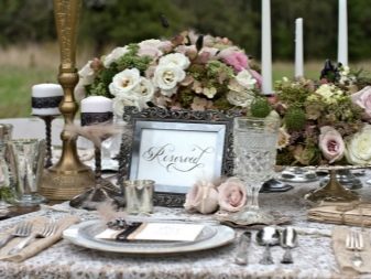 Glitter and rhinestones are unusual for this style of wedding celebration. All design should be done as accurately as possible and clarified. So, bright colors are unusual for such a design. Pastel shades are chosen: silver, bluish-white, greenish. In the design of the banquet room, flowers and greens (on tables, walls), cages with live birds, and lit candles are welcome.