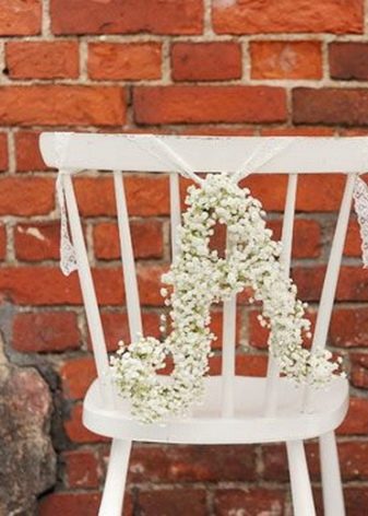 - The chairs of the newlyweds, decorated with initials from living plants, look very unusual. The letter of the bride’s name is made of small white flowers, and the first letter of the bride’s name is made of fern.