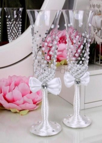 Simple and stylish, you can make glasses with satin ribbons. It is enough to wrap the fabric of one or several colors around the wine glass several times, and form a bow from the tips. Decorate ribbons can be medium-sized crystals. It is better to burn the ends of the tapes so that they do not scrub and do not open. A glass with lace decorated with rhinestones and beads will look very gentle. If desired, you can add 5-6 flowers per tone to these elements.