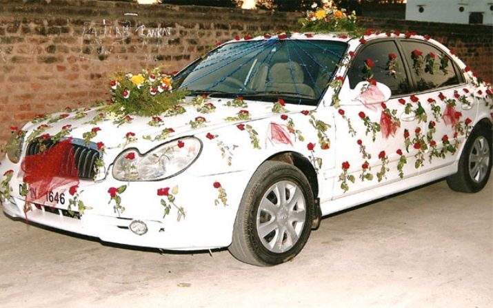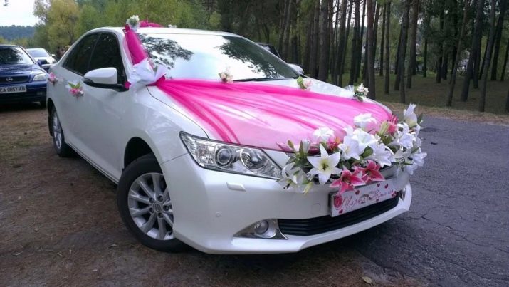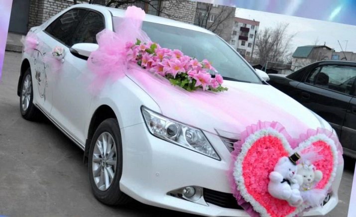 The easiest option for decorating cars is to decorate them with colored satin ribbons. These decorative elements are attached to the bumper of the cars front and rear. For those who are not looking for easy ways and are ready to make a real masterpiece from a wedding procession, one can recommend using living and artificial flowers, soft toys, large bows in the design of a car. By the way, real flowers can be mounted not only on the front bumper, but also on the doors of the car. To do this, plants are collected in miniature bouquets, tied with silk ribbons and decorated with a bright mesh veil. Bouquets are fixed near the door handles.