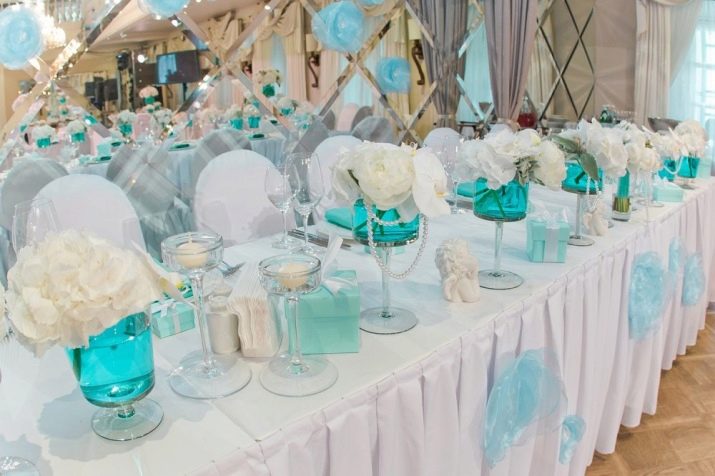 If the banquet hall for the wedding is entrusted to decorate the designer, you should not interfere in his concept, trying to improve it. The specialist knows better what the final result will be. If he brings your wishes into a pre-thought out scheme, the general idea of decorating the room may be violated. For those who have little design experience, the question may arise about choosing the appropriate color for the decoration of the room. In this matter it is very important not to overdo it, otherwise the hall will look too colorful and uncomfortable. It is better to give preference to pastel colors, they are a universal option. If you are arranging a thematic wedding, for example, in a marine style or in the Tiffany style, then it is much easier to determine the color scheme - white-blue and mint.