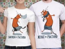 - T-shirts with inscriptions. Instead of funny inscriptions, you can use the image, each half of which is located on one of the shirts. They will look like a whole only when the newlyweds stand close or hug each other. Cool lovers' bathrobes, slippers, mittens are also suitable for lovers.