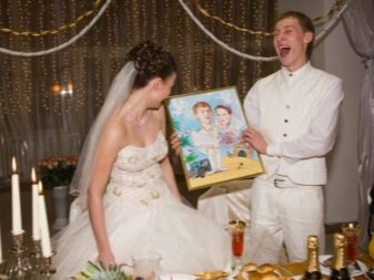 - Portrait or cartoon - that’s what really becomes the decoration of the family nest. A similar surprise can be ordered in advance, since most artists can paint a portrait from photographs or directly on a wedding day. The services of a cartoonist are not so expensive, and he can depict not only the newlyweds, but also the guests. Already finished works involuntarily cause a smile and cheer up.