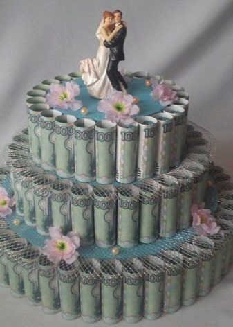 The money cake looks very nice. To make it, you need to make two, or better, three layers of cardboard, with a height equal to the height of the banknote. The amount that you planned to donate must be exchanged for smaller banknotes. The diameter of each layer will depend on their number.