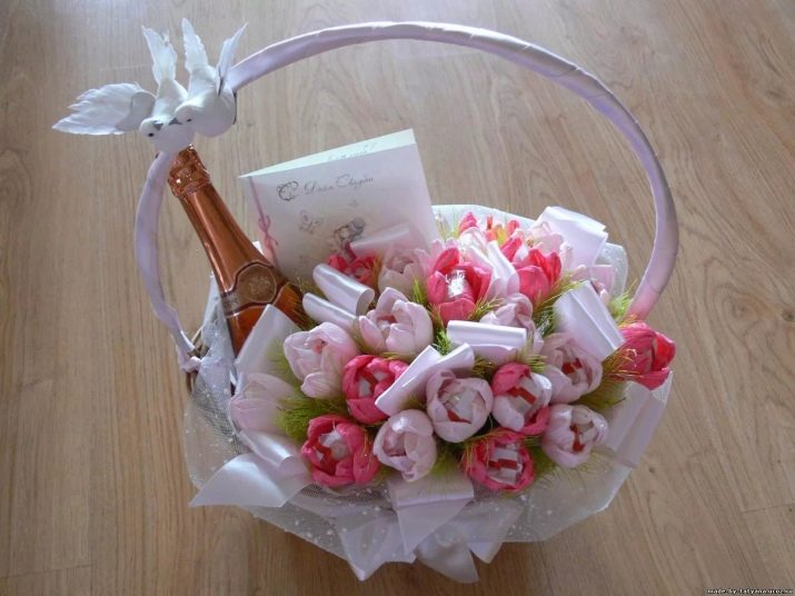 - Bouquets. Almost every guest attends a wedding with a bouquet, since it is flowers that are associated primarily with something solemn and festive. In order not to be commonplace, instead of flowers, a bouquet can be made up of sweets, tea, fruits, vegetables or alcoholic beverages. Such a gift will last much longer, in addition, it is not only beautiful, but also useful.
