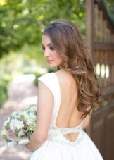 If the length of the bride’s curls allows, you can quickly create a hairstyle that will give an image of naturalness and romanticism. An original flower arrangement or one large bud is added to long soft waves. If the girl has a narrow face, then you should choose the option with lush curls. It is recommended to issue a similar form with a diadem.