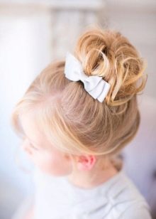 Ponytails, which can be complicated by twisting the hair into bundles, are also good. It turns out very cute sticking out ghouls. But this option can only be modeled from long or medium hair. A creative hairstyle will be a bow made of hair. It is created based on the tail. For modeling, you need to tie the base tail. Passing the hair through the elastic for the last time, you need to make a loop (the hair does not stretch completely). In this case, the ends remain in front.