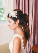 You can use a satin ribbon with flowers to emphasize the sophisticated image of the bride. The tape covers the tail or the base of the styling. Having lightly wrapped the tail, the ribbon should be tied, but not very tightly, the ends of the ribbon are hidden under the bottom of the hairstyle. If the tape is long, then it can be beautifully moved with the hair.