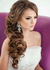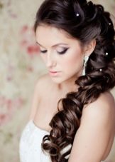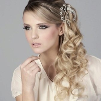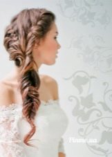 If the bride wants to be playful and mischievous, then a hairstyle with a side tail is what you need. This hairstyle is done in a casual relaxed style. The hair is not combed tightly on one side, at the bottom they are fastened with an elastic band or tape, forming a low tail. On the other hand, where the hair was combed, they usually attach some kind of accessory, for example, in the form of a falling chain with rhinestones imitating diamonds.