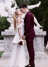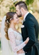 The hair itself can be curled so that it descends in waves on the shoulder. There are two decisions on where to fix the tail. If the bride wants a more relaxed and romantic look, then it is worth fixing the hair with an elastic band in the area of the cheekbones. The tail, fastened on the crown, is suitable for a more flirty image.