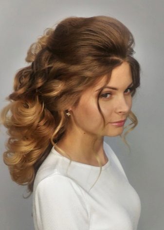 Hair is pulled back completely. The hairdresser can leave some thin curly strands at the temples or neck for showiness.The strands gather high on the occipital part, forming a similarity of the crown in shape, or in a simpler version the knot is located quite low, closer to the neck, and curls of various shapes are knocked out of its volume, as if on purpose.