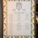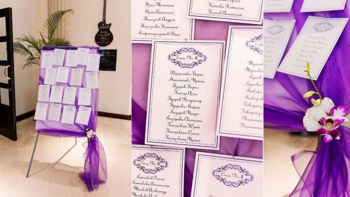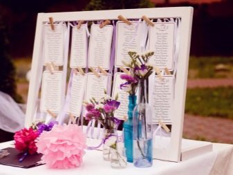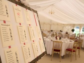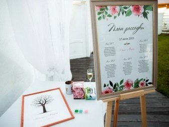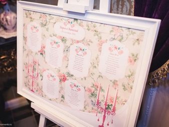 However, you can draw up an easel or poster not only with a list. It can be a beautifully drawn plan of the banquet hall. According to it, guests will easily navigate and will know which part of the room they are going to. In addition, if the tables are arranged in a European style, then each of them can be assigned its original name. Varieties of wines, names of garden flowers, precious stones, dances or shades can serve as options. If the number of invited is more than 15 people, then you need to do 2-3 identical copies and place them in different places in the hall.This will save people from having to stand in line in order to find out their place and will contribute to a quick and calm seating.