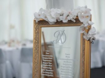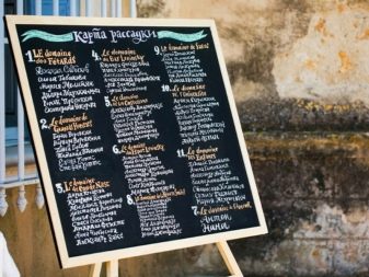 The stand with the list and name cards can be ordered at the printing house, whose specialists will help you choose the right design that matches the main style and idea of the holiday. However, printed matter, no matter how beautiful it may be, has become a little boring and especially does not impress anyone anymore, so if you have free time, it’s better to draw up the props yourself. Homemade cards look much more soulful than those printed on the printer and will be remembered for a long time by the guests of the holiday.