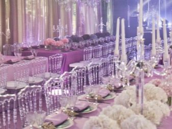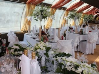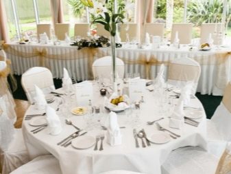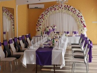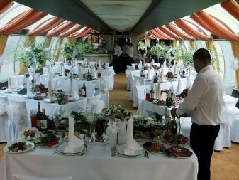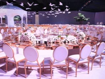 With this arrangement, the central part of the banquet hall usually remains free, turning into a place for games, competitions and dances. When arranging a "herringbone", the ends of all tables should look at the table of the newlyweds and in no case vice versa. The location at which one of the long sides of the guest table is "looking" at it is wrong.
