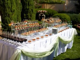 - Reception "buffet" It is used in the case when the organization of a magnificent banquet is not planned, and the couple immediately after registration leaves for a honeymoon. Under such circumstances, the ideal option would be to set up buffet tables without using chairs. The tables usually have drinks and light snacks, and the event itself resembles a short party.