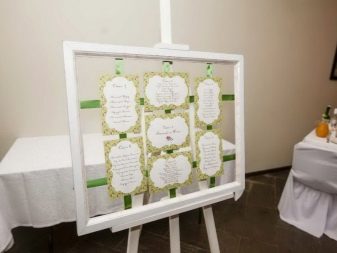 The form of the information poster and its layout must be thought out in advance, this will allow you to quickly create the necessary props and draw it beautifully. So, for weddings held in the country style, it will be appropriate to make a poster in the shape of a window and place it on a tripod. If the wedding is held in a vintage style, then you can take a stylized board and write on it with chalk all the necessary information. An interesting option would be to write the numbers of tables and guest names with a marker on a glass stand.