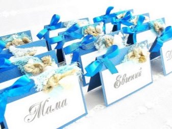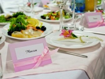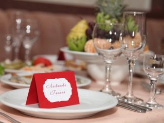 The design of cards should repeat the design of invitations and closely intertwine with the decoration of the hall and the color trends of the celebration. The names of peers are registered without indicating a middle name, while for older people it is mandatory to spell it, but it is better not to write the surname in both cases. The exception is the presence at the banquet of two or more people with the same name. In this case, the spelling of the surname is necessary.