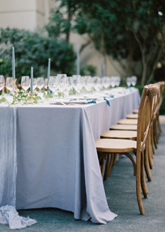 - U-shaped method table setting is suitable for more numerous weddings, where the number of guests reaches 50 people. This also includes the W-shaped arrangement, which is used in cases where the number of guests exceeds 60 people. However, with both methods of placement, you need to pay great attention to seating the guests and in no case let it go by itself. This requirement is due to the fact that a significant part of the invitees will be located with their backs to each other. This will seriously impede communication between close people who did not get a place behind one "sleeve" of the table, and will force them to eat and chat in half-turn.